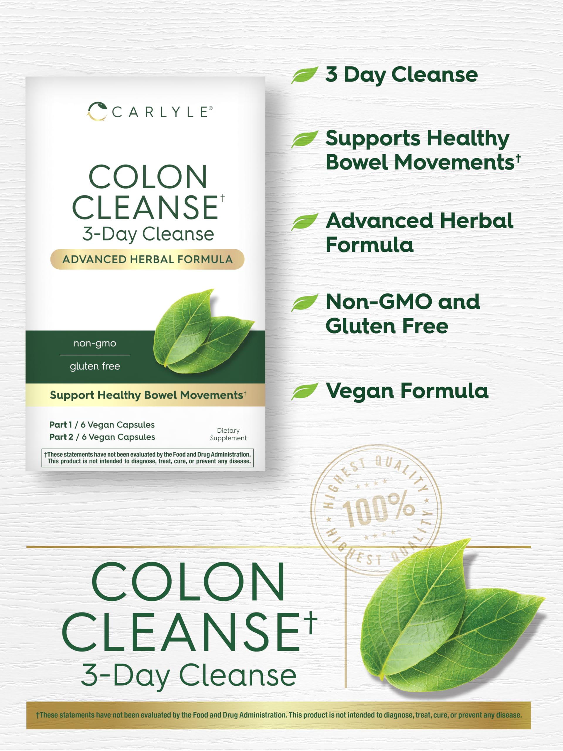 Carlyle Colon Cleanse | 12 Vegan Capsules | 3 Day Cleanse | Advanced Herbal Formula | Support Healthy Bowel Movements | Non-GMO and Gluten Free Supplement