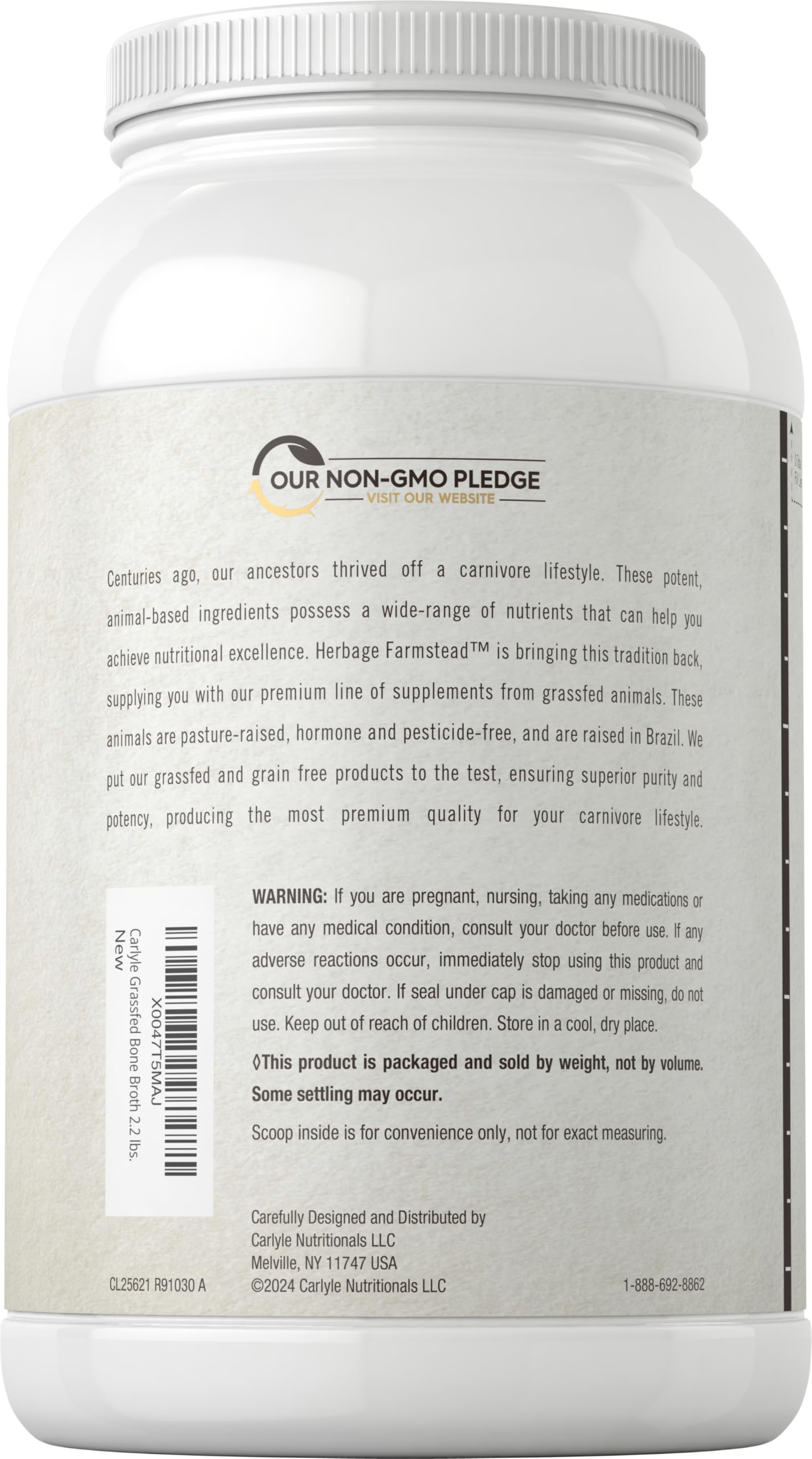 Carlyle Grass Fed Bone Broth Protein Powder | 35.2 oz (2.2lb) | 20g Protein | Pasture Raised, Grain Free Supplement | Non-GMO & Gluten Free | By Herbage Farmstead
